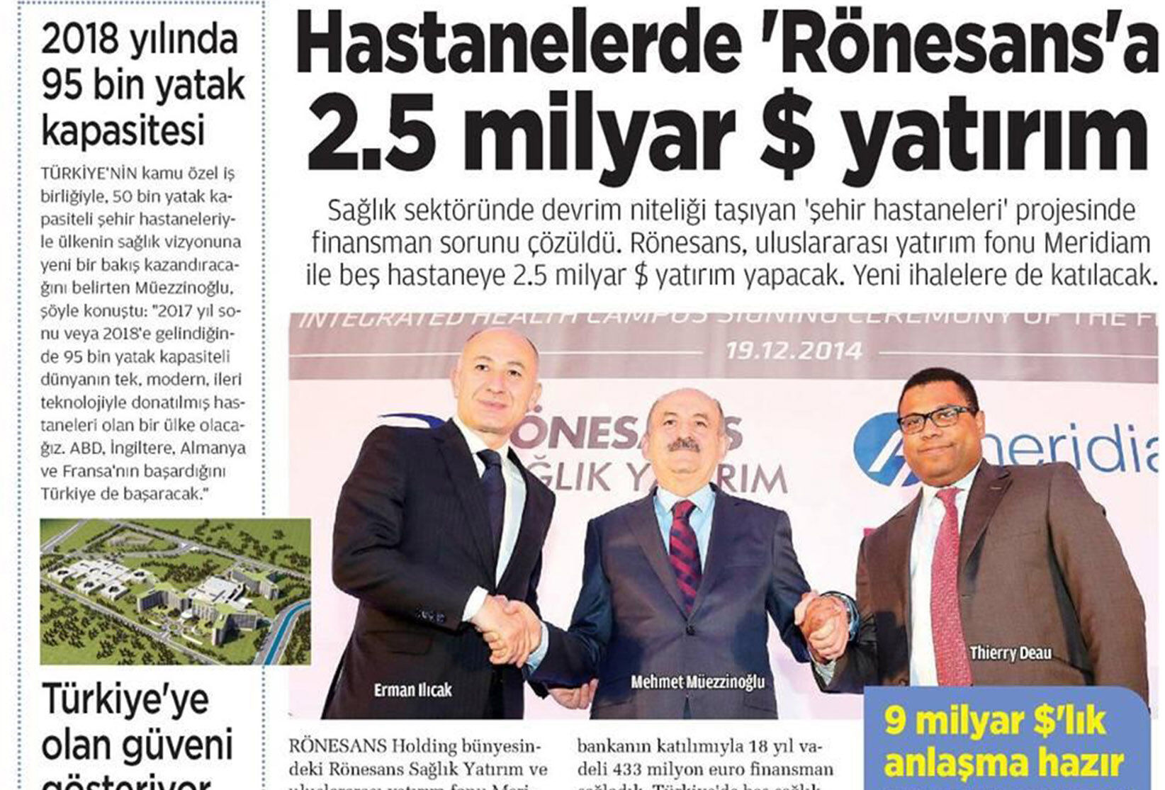 Türkiye’nin sağlık sektöründe bugüne kadar gerçekleştirdiği en büyük proje olarak adlandırılan ve ülkemizin çok sayıda modern hastaneye kavuşacağı “Kamu Özel Ortaklıkları-PPP” (Public Private Partnership) projesinin dev adımlarından biri Rönesans Sağlık Yatırım ve Meridiam ortaklığından geldi.