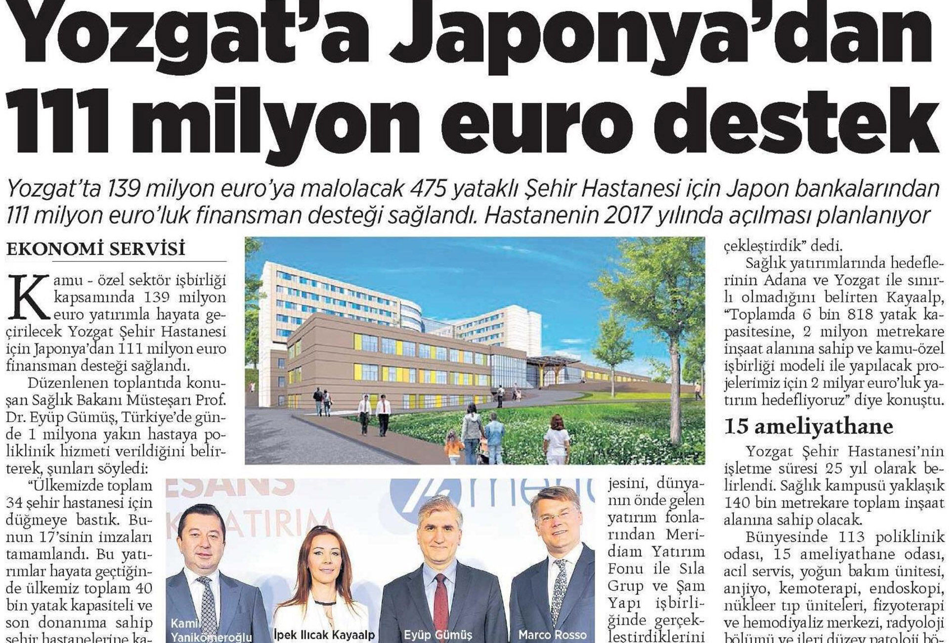 2 Haziran’da projenin finansal kapanış imza töreni için düzenlenen toplantıya, Sağlık Bakanı Müsteşarı Prof. Dr. Eyüp Gümüş, Rönesans Holding Yönetim Kurulu Başkanı İpek Ilıcak Kayaalp, Rönesans Sağlık Yatırım Yönetim Kurulu Başkanı Kamil Yanıkömeroğlu ve projenin iş ortağı kuruluşlarının yetkilileri katıldı. 475 yatak kapasiteli ve son derece donanımlı Yozgat Şehir Hastanesi projesinin yatırım maliyetinin 139 milyon euro olarak açıklandığı toplantıda, bunun 111 milyon euro’luk kısmı Japonya’nın iki önemli bankası Sumitomo Mitsui Banking Corp (SMBC) ve Bank of Tokyo Mitsubishi (BTMU) ile dünya devleri Siemens ve Intesa’dan temin edileceği vurgulandı.